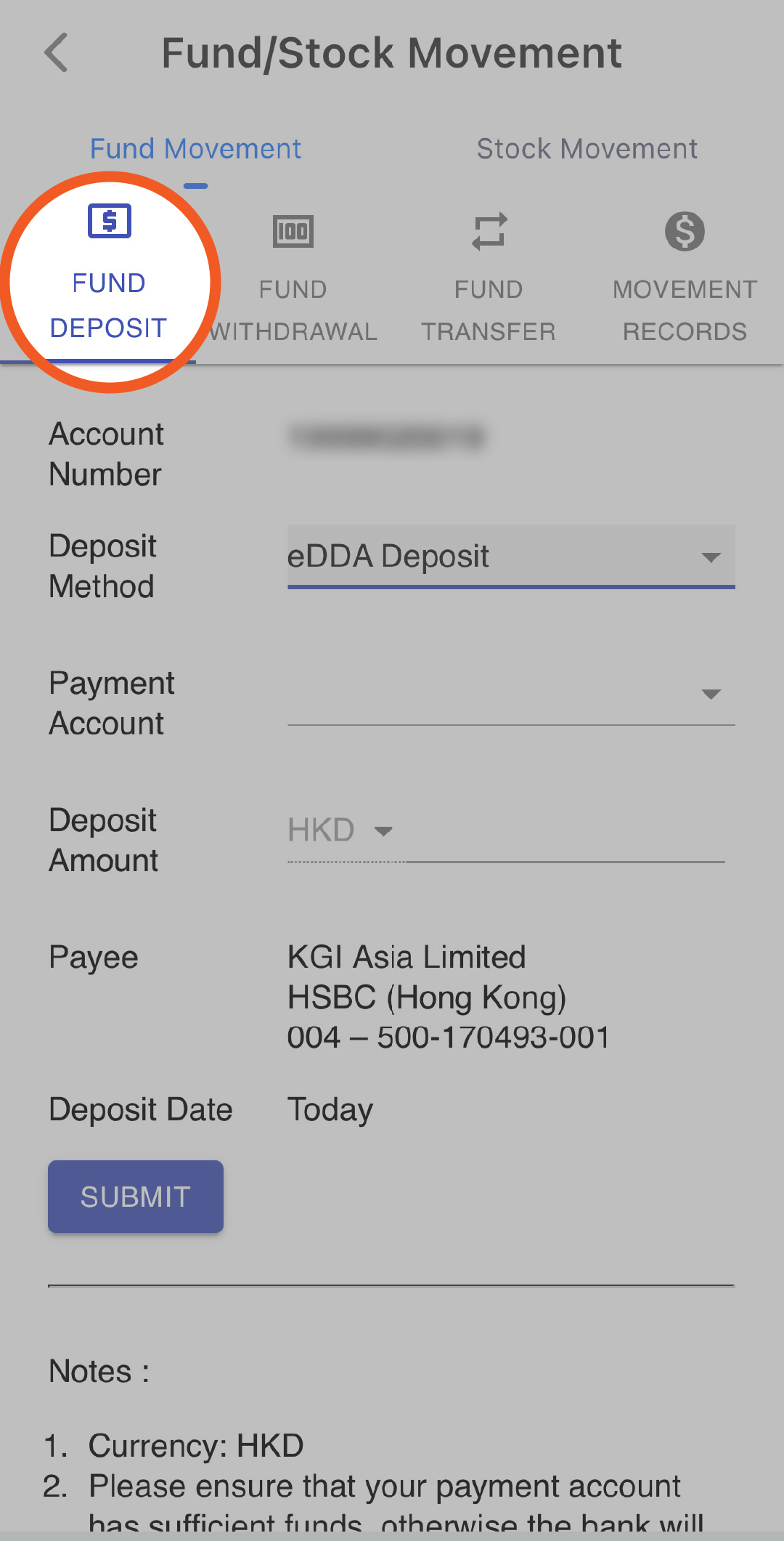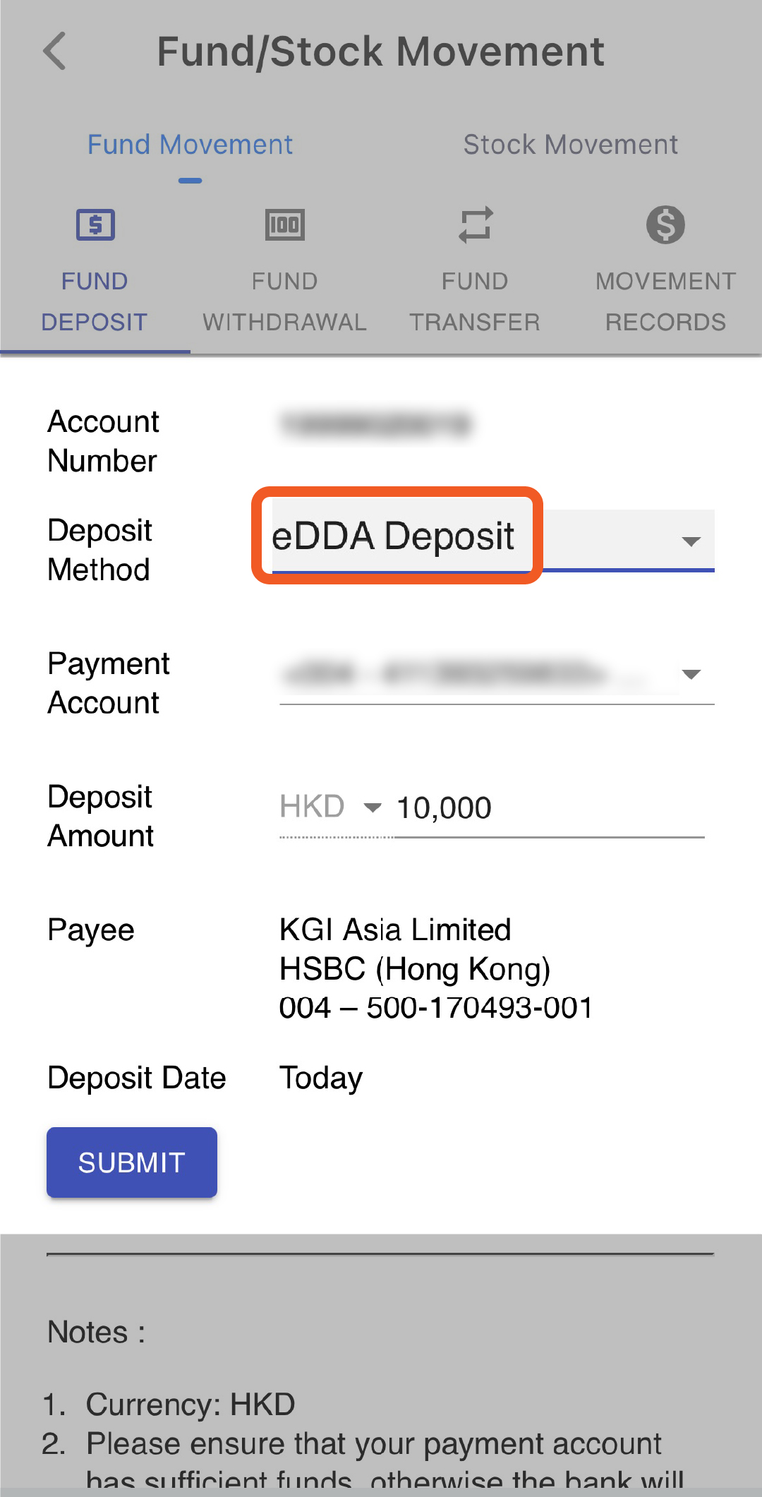 Step 3: Select“eDDA Deposit”in“Deposit Method”and bank account* in“Payment Account”. Input deposit amount and deposit date then click “SUBMIT”.