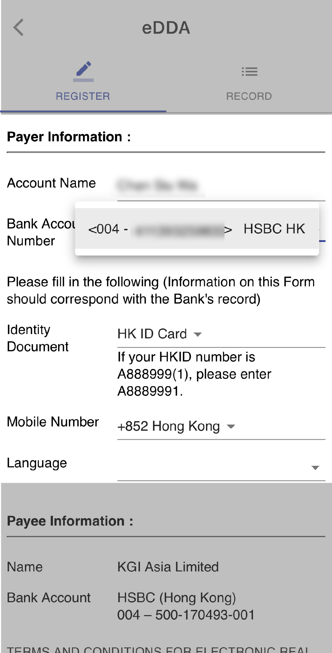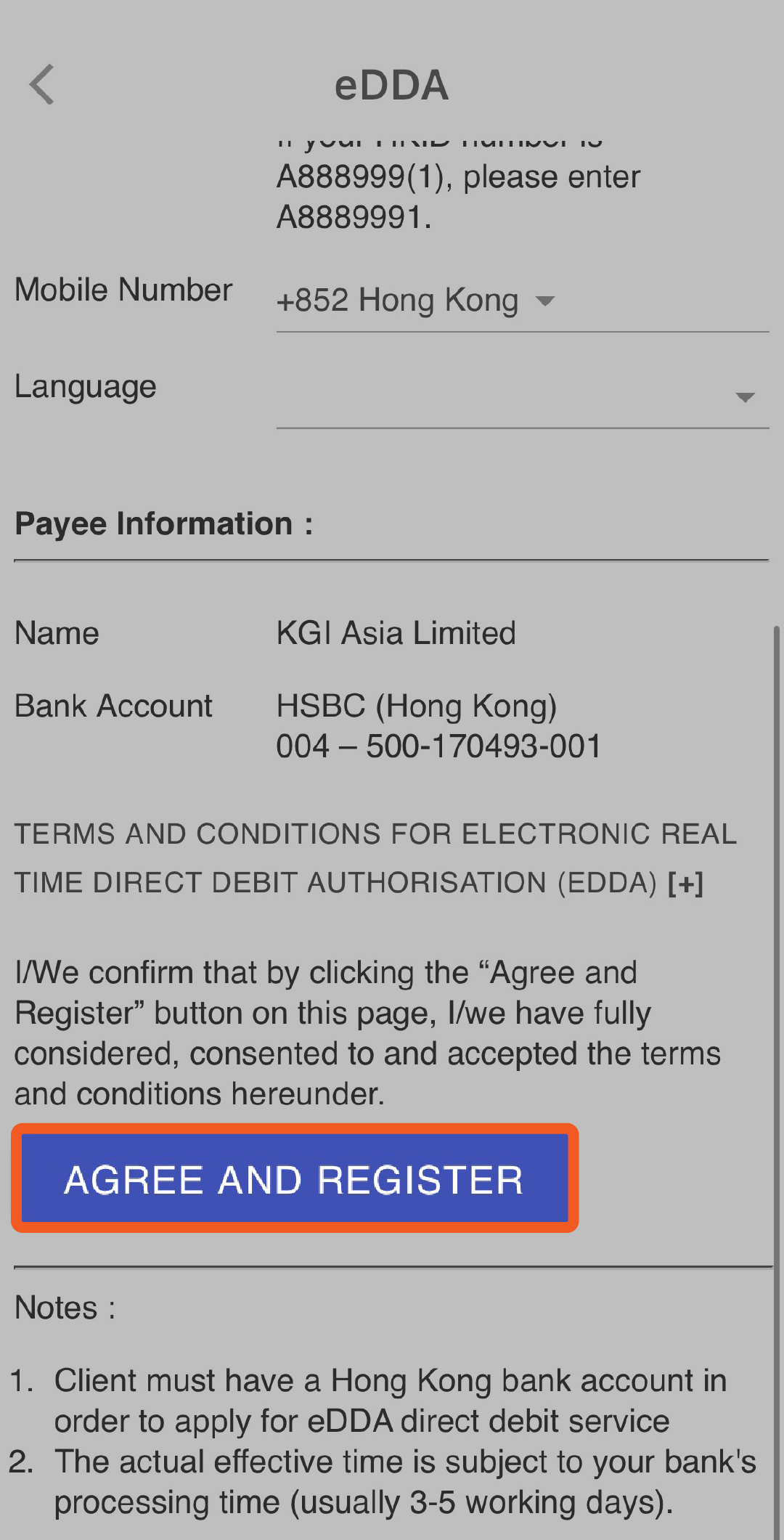 Please note: If you are registering with a HSBC account, your eDDA service will take effect immediately. For other bank accounts, the effective time will be subject to the bank's processing time which generally takes 3-5 working days.
