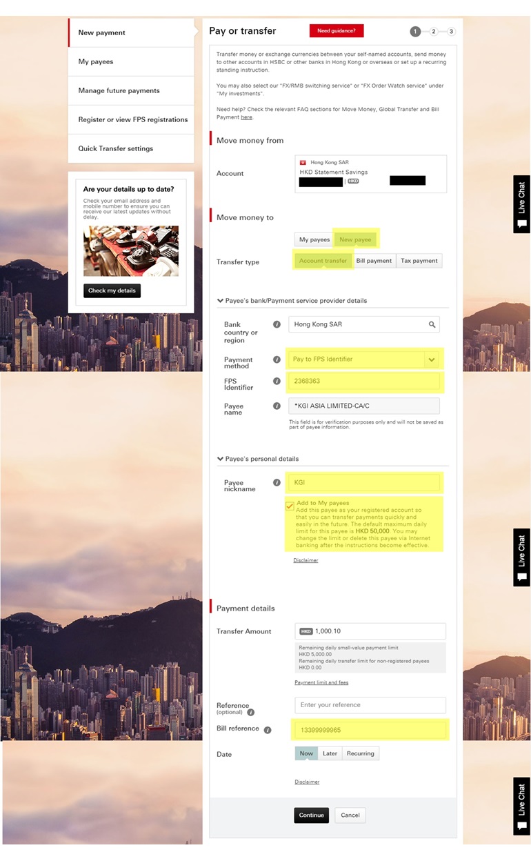 - Choose "Pay to FPS Identifier", fill in KGI's FPS ID: "2368363"