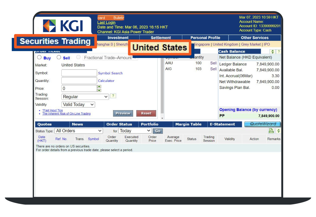 Login Webtrade > click “Securities Trading” and “United States” in menu bar