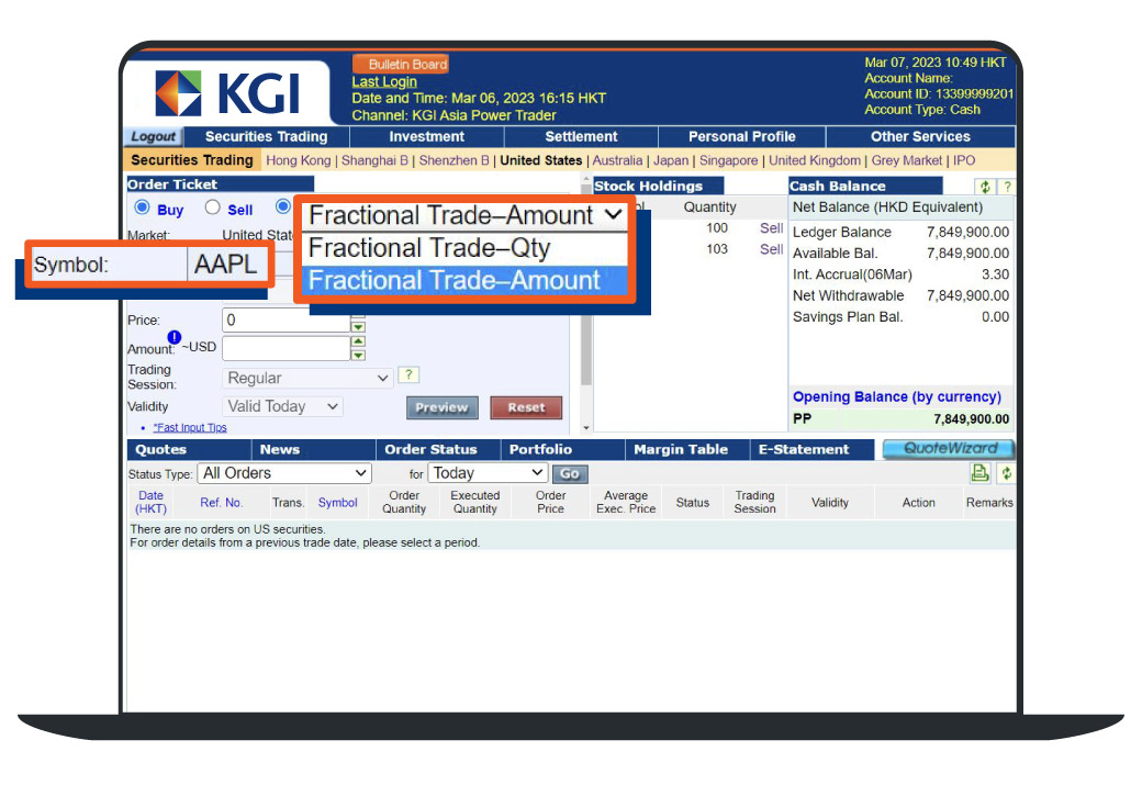 If you place an order using “Fractional Trade-QTY”, a minimum quantity of 0.00001 share must be entered and its order amount should be more than US $10.