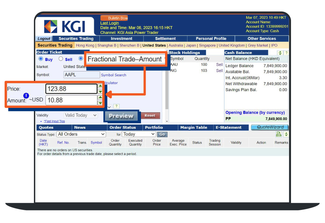 If “Fractional Trade – Amount” is chosen, client just needs to input “Price” and “Amount” and system will automatically calculate the quantity of stock for reference, after that click “Preview” to confirm the order