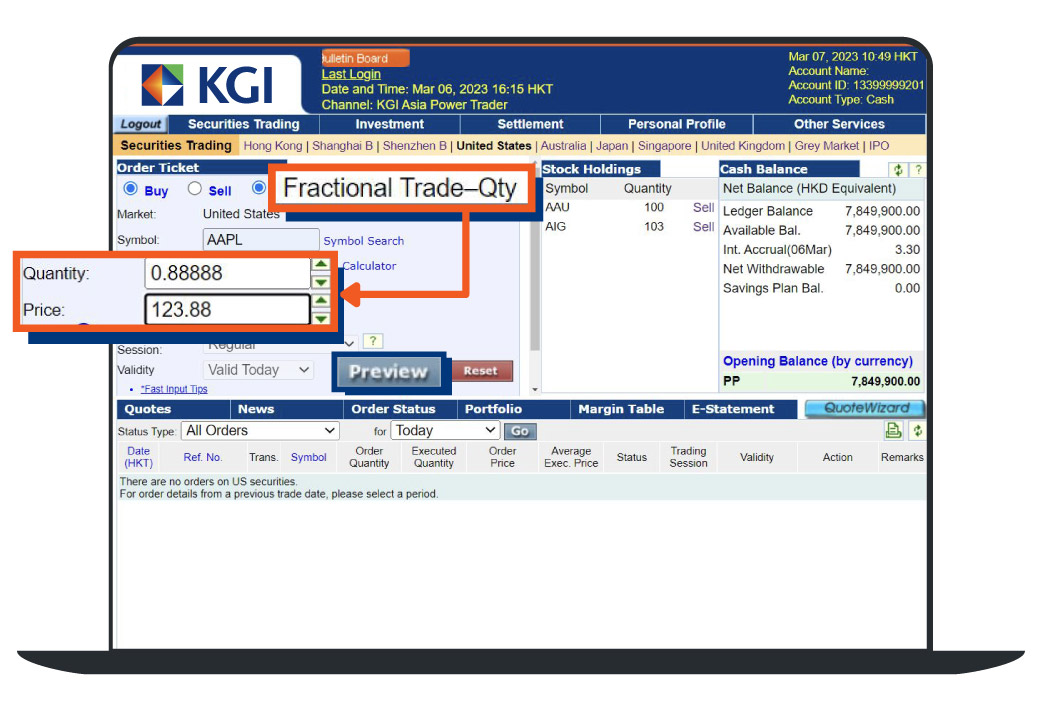 If “Fractional Trade – Qty ”is chosen, input “Quantity” and “Price” and system will automatically calculate the amount for reference, after that click “Preview” to confirm the order