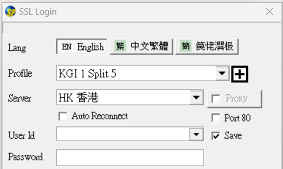 You can login via  website “eFO SP” or   SP Trader Pro HD (Mobile App).Select the profile “KGI 1 Split 5”.  If the profile “KGI 1 Split 5” is not listed, please manually enter the host (spauto.kgi.com.hk) to login.