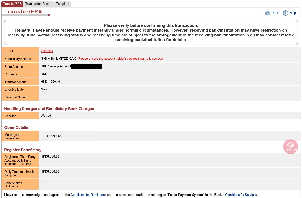 - Input your KGI 11-digit account number (e.g. 13399999965) in "Message to Beneficiary"